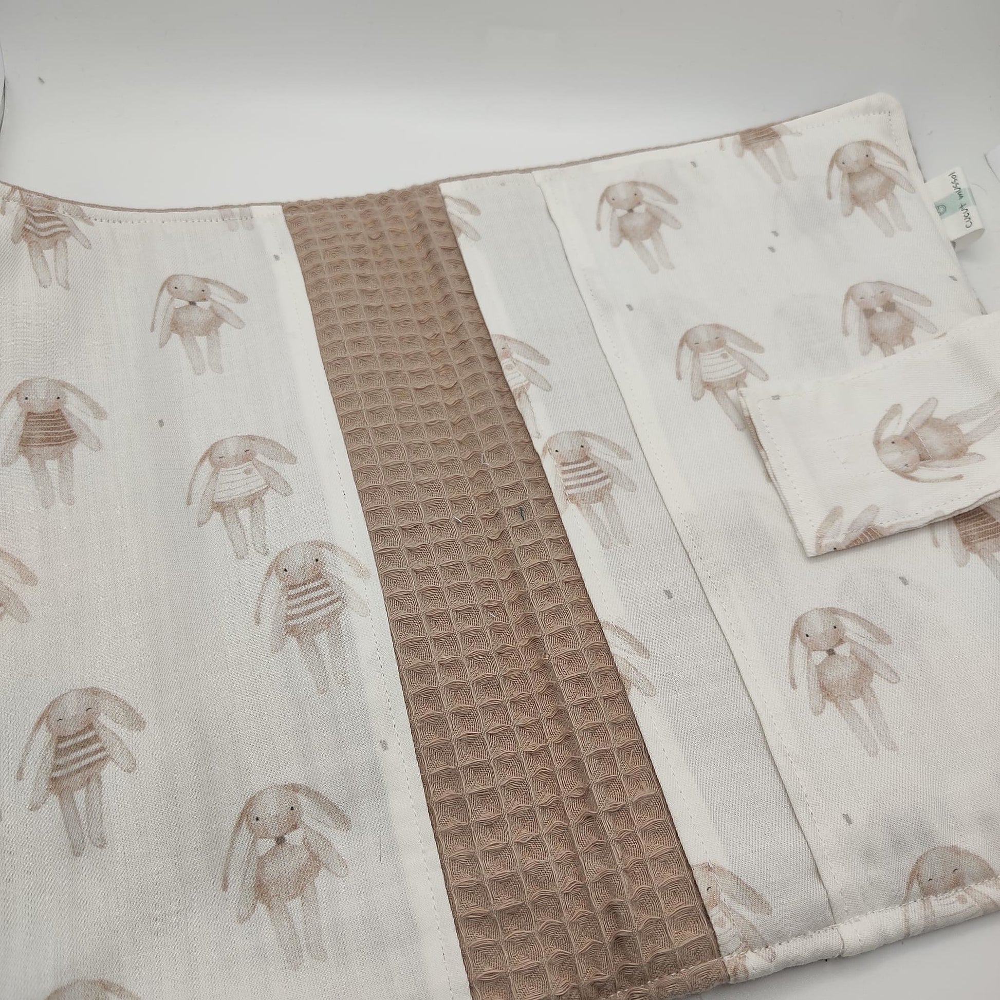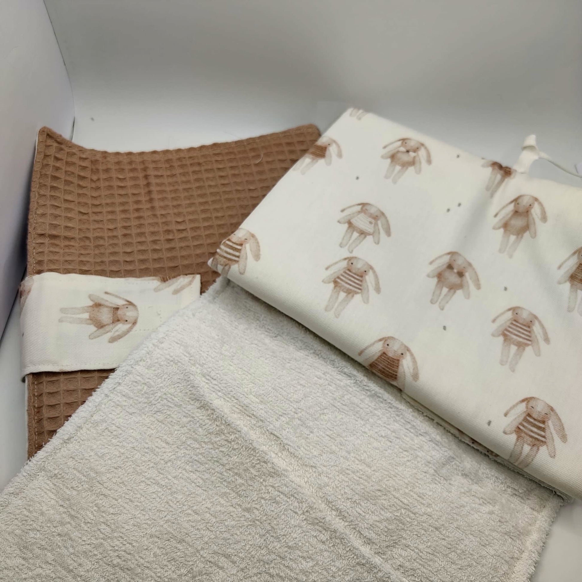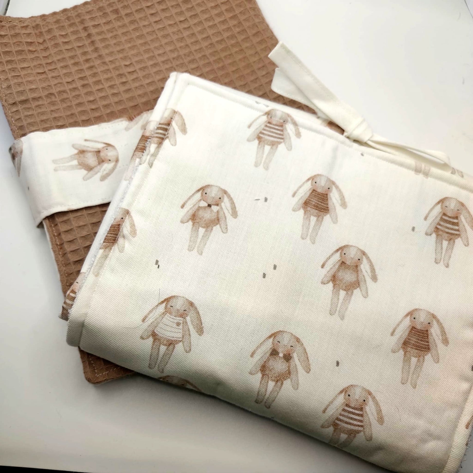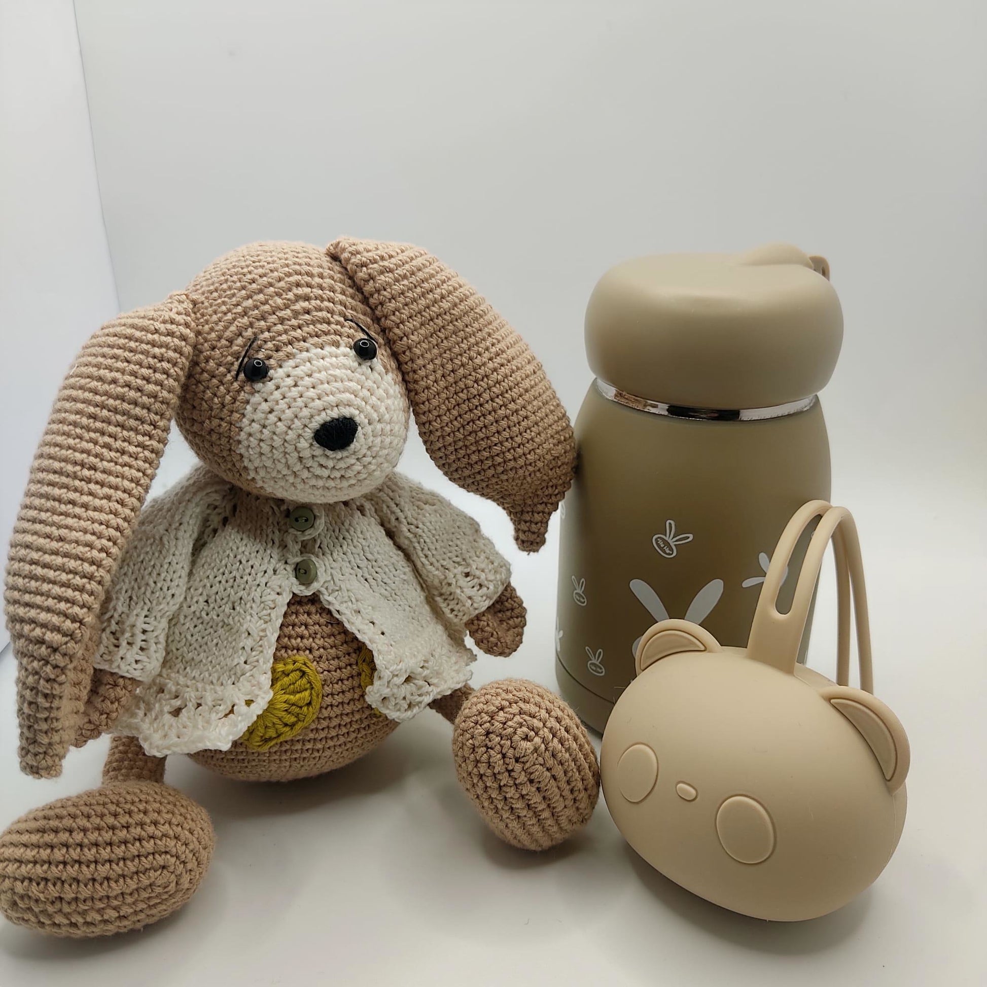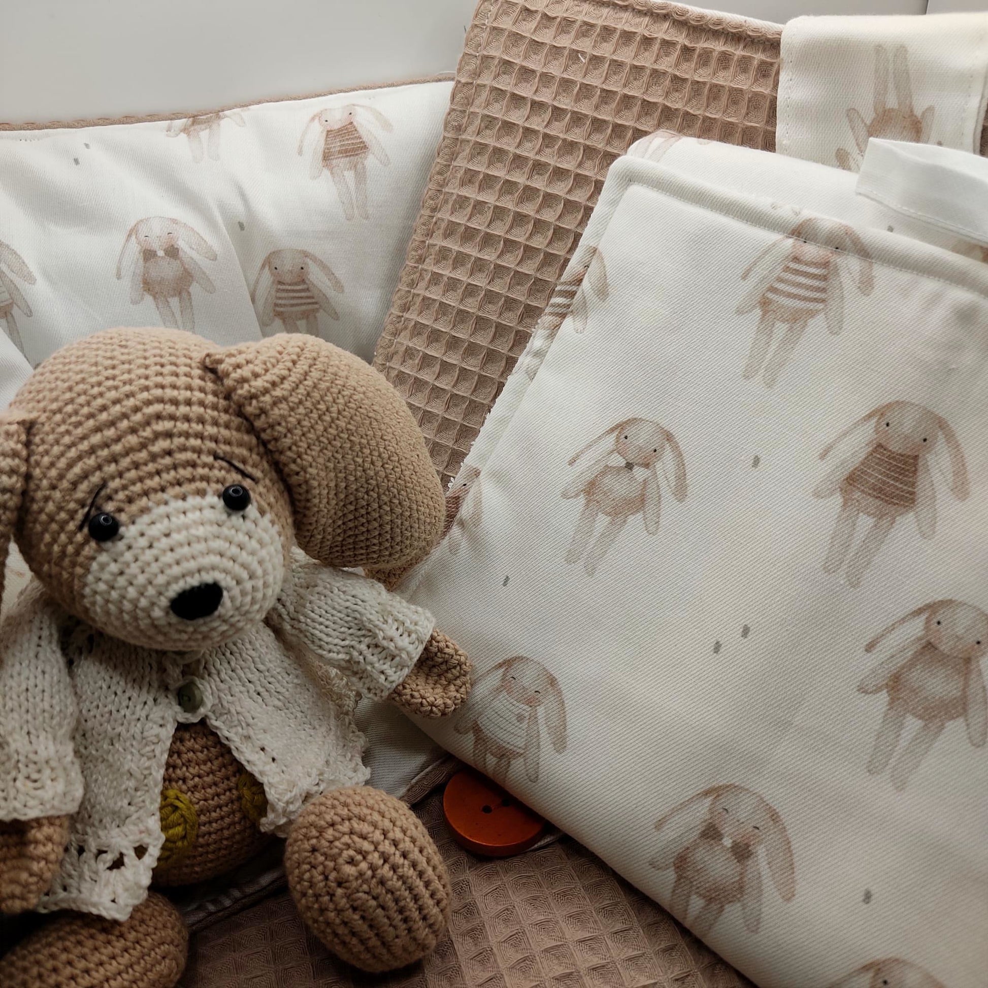 Cada pieza está hecha a mano, una a una, en nuestro pequeño taller. Cuidamos los tejidos, los acabados y hasta los lazos, porque sabemos que lo importante está en los detalles. No solo es una canastilla: es un pedacito de amor preparado para dar la bienvenida a la vida. Dentro encontrarás un saco de dormir mullido y cálido, un porta pañales y cambiador prácticos y suaves, un porta chupete, un termo para los paseos, y un tierno conejito que se convertirá en su primer compañero.