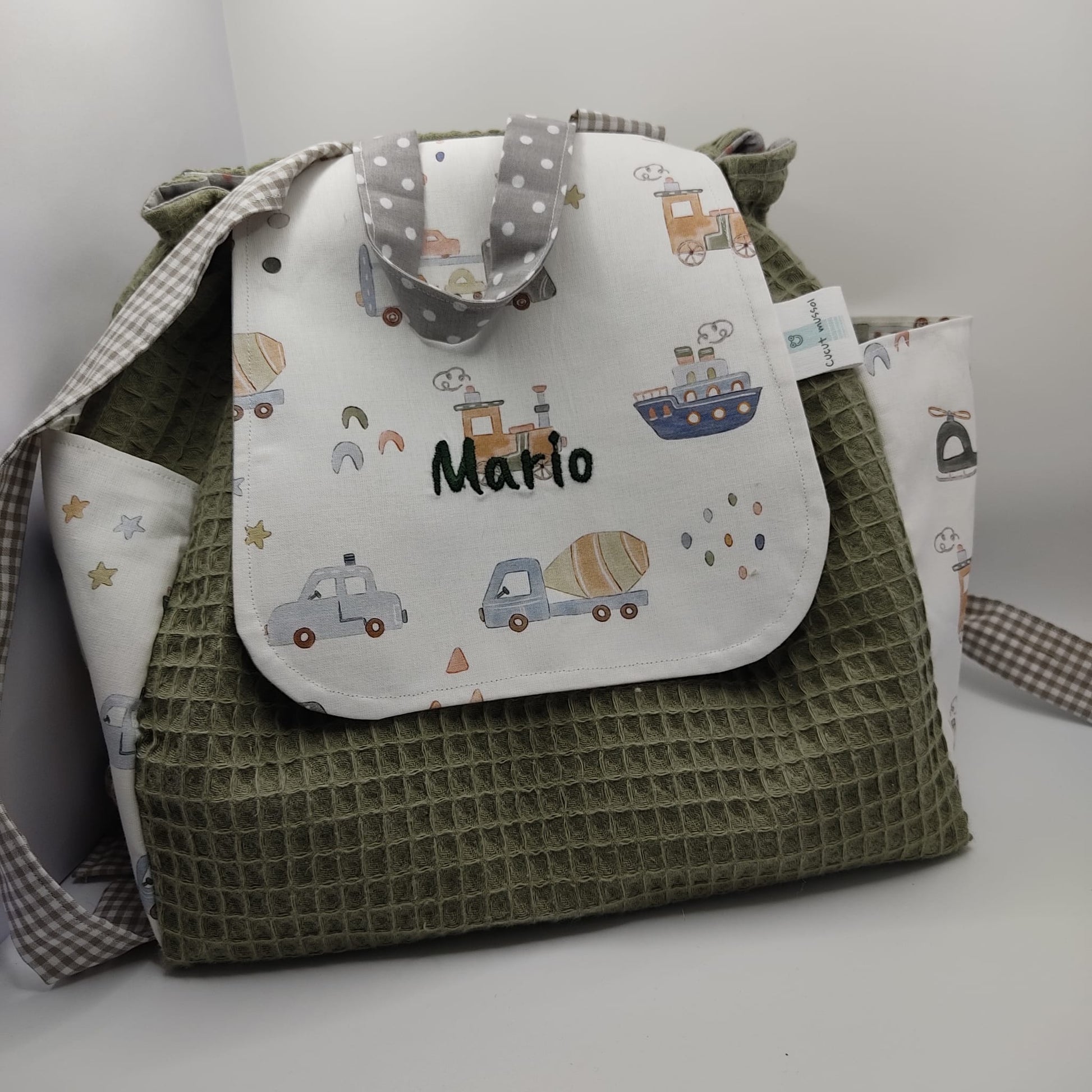 Mochila estampada: Práctica y ligera, perfecta para llevar todo lo necesario en los primeros paseos de Mario. Su original tela estampada le da un toque alegre y único.