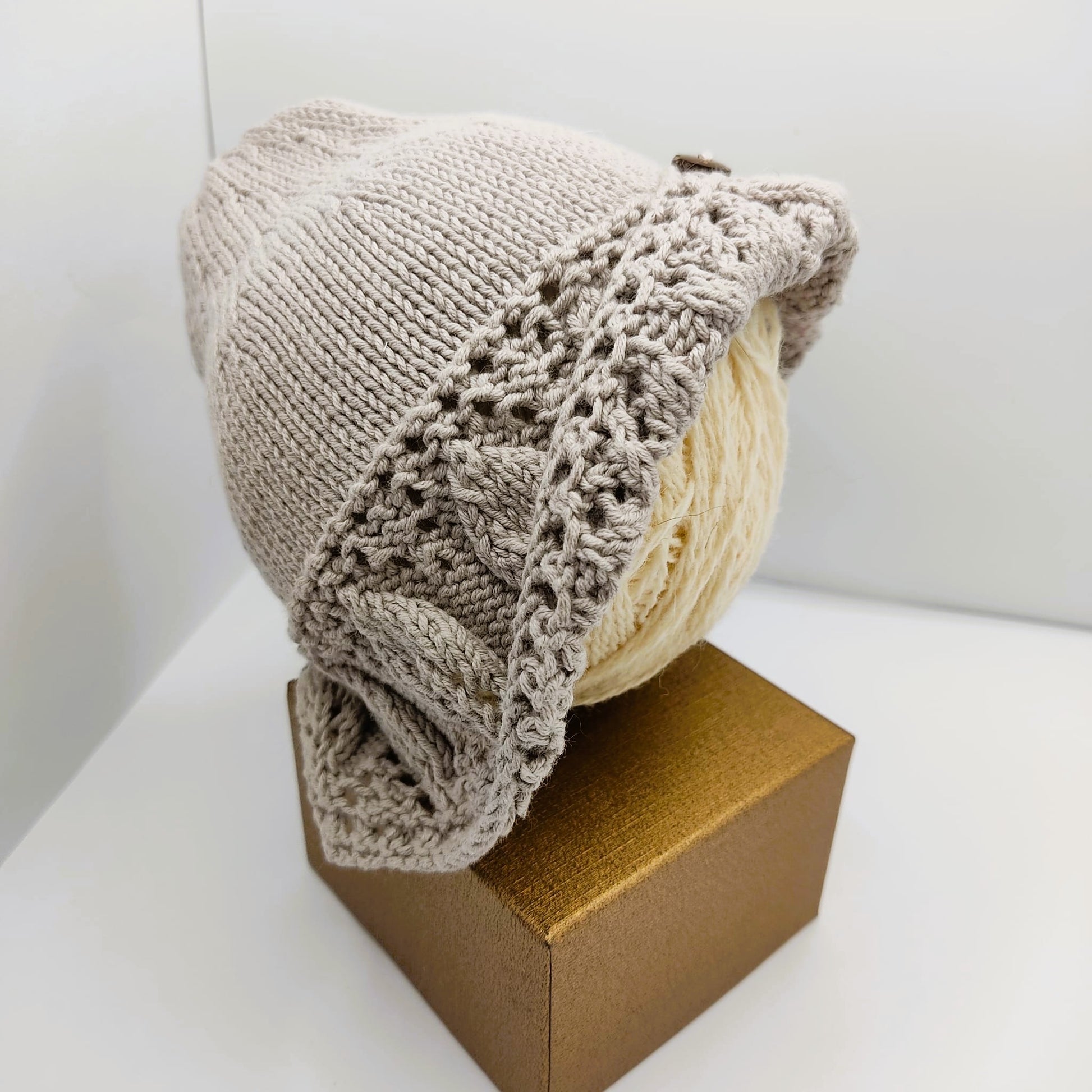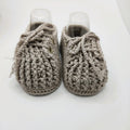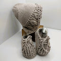 Zapatitos: Tejidos a mano en hilo de algodón gris, aportando suavidad y transpirabilidad para los delicados pies del recién nacido.
