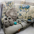 Todos los artículos de la canastilla han sido confeccionados a mano con materiales de alta calidad, pensando siempre en la delicada piel del bebé. Mientras que el saco de dormir, el cambiador y el porta pañales han sido realizados en tela de algodón con un precioso estampado vintage azul, los zapatitos y el gorro se han tejido cuidadosamente en hilo de algodón color gris, combinando diseño y funcionalidad.