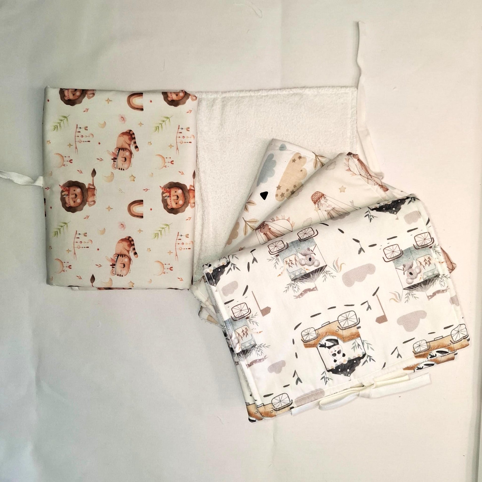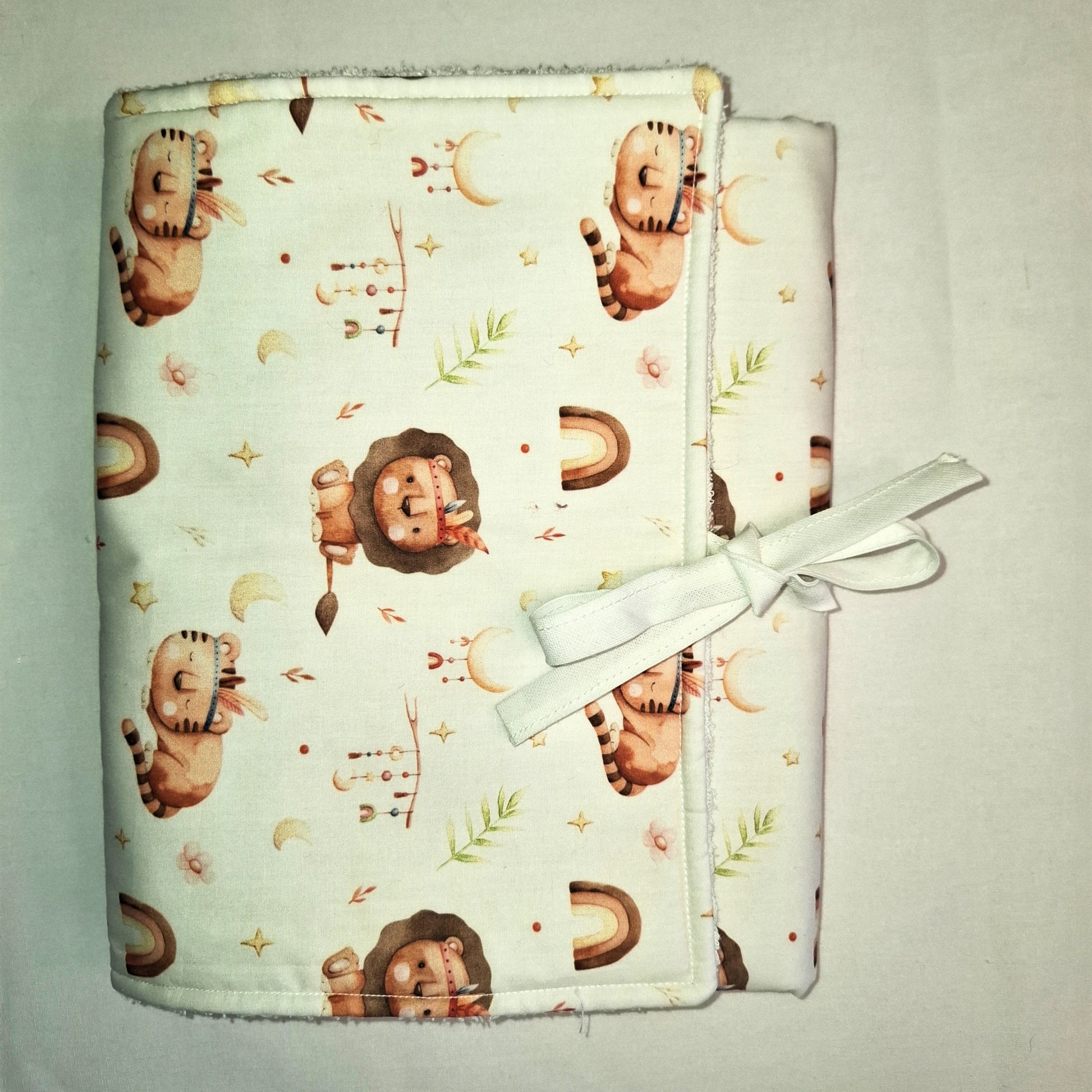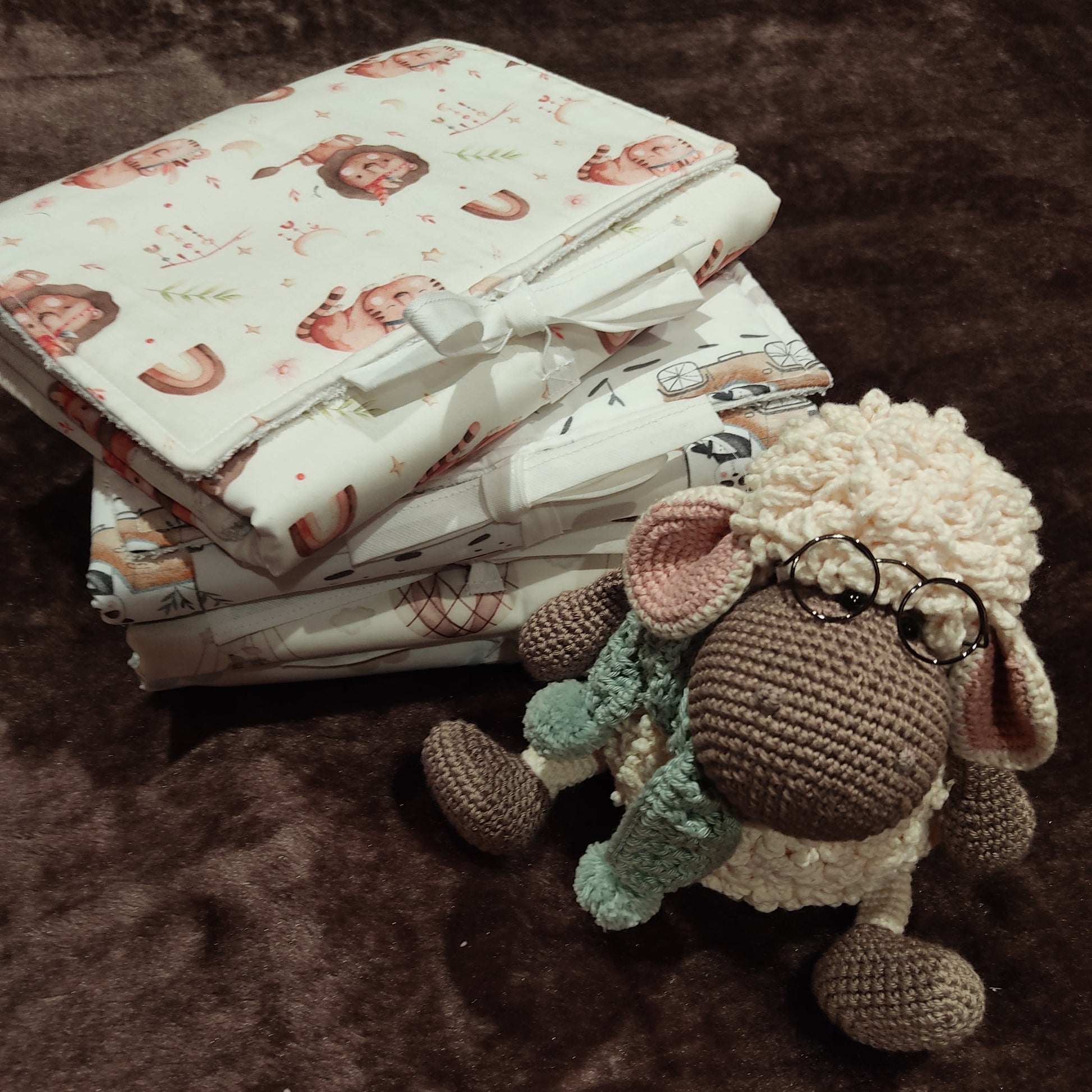 Exterior personalizado con la tela que elijas, interior de rizo blanco plastificado, y un acolchado extra para la comodidad del bebé. Se cierra con una lazada y es fácil de lavar.