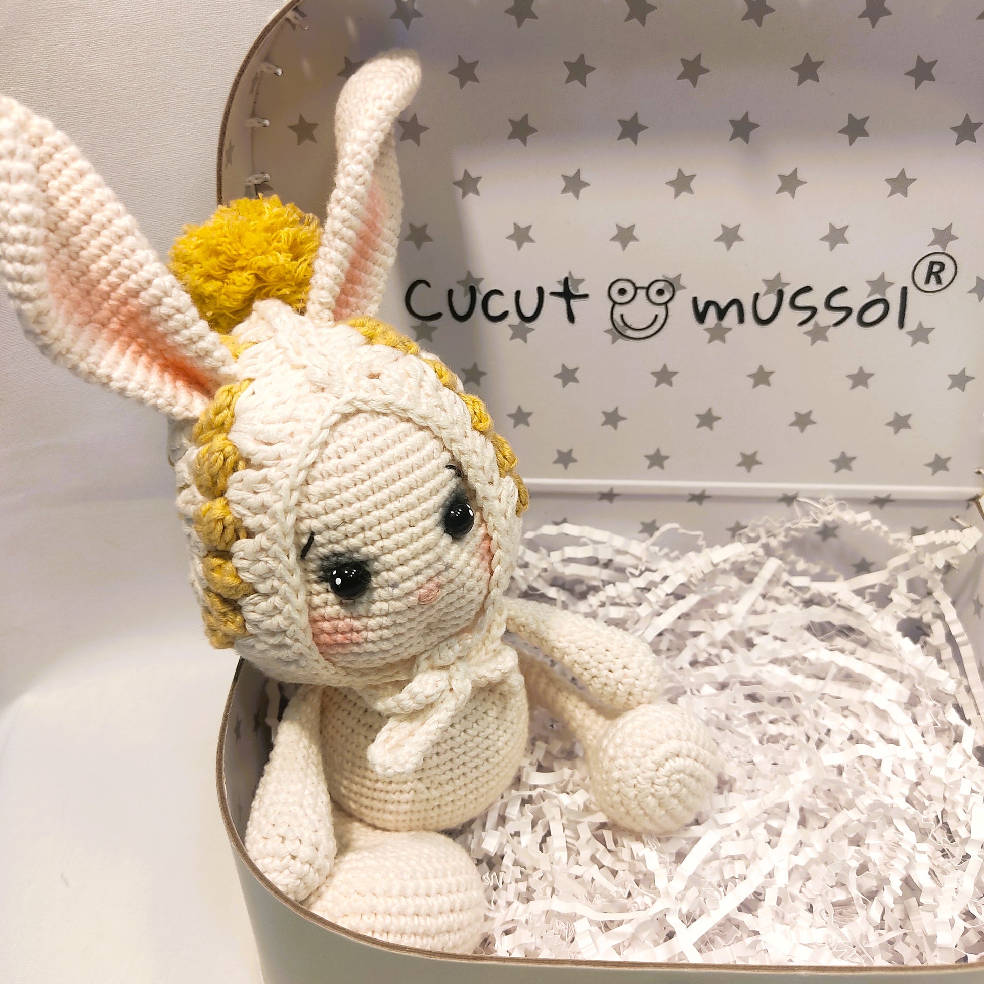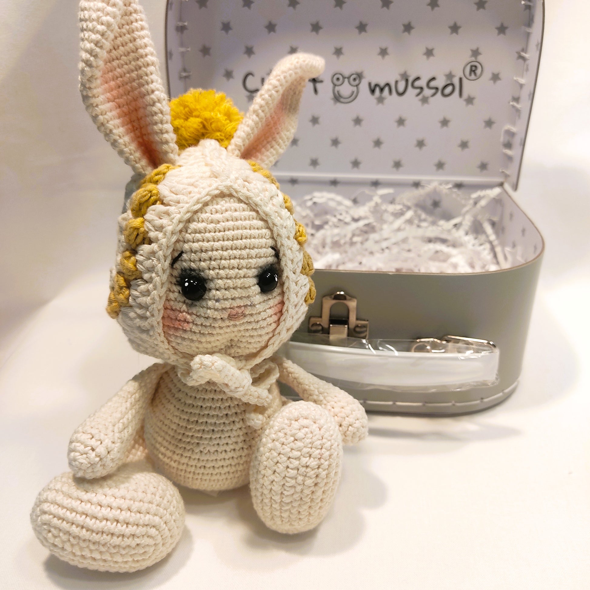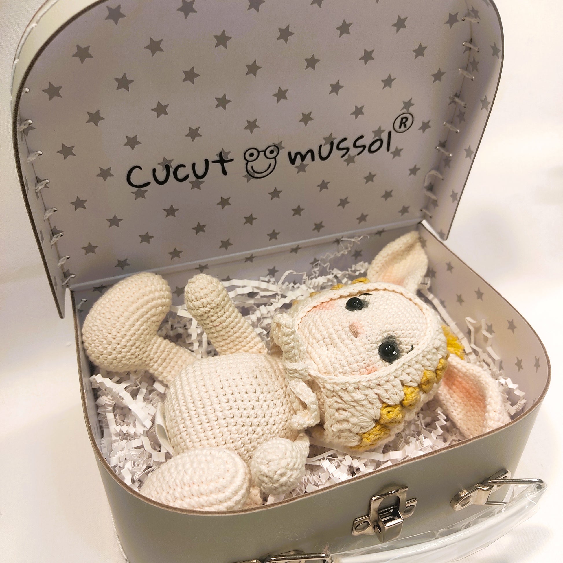 La maleta regalo es de un suave gris claro con el interior en blanco salpicado de estrellas también grises, y dentro vive el adorable Rabbit Roi, el indispensable compañero de juegos, realizado con la técnica del crochet, punto tras punto, dispuesto a dar y recibir afectuosos mimos y abrazos.