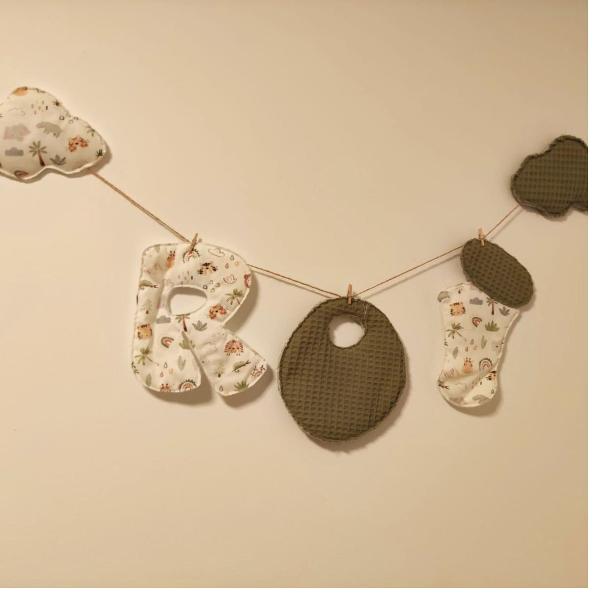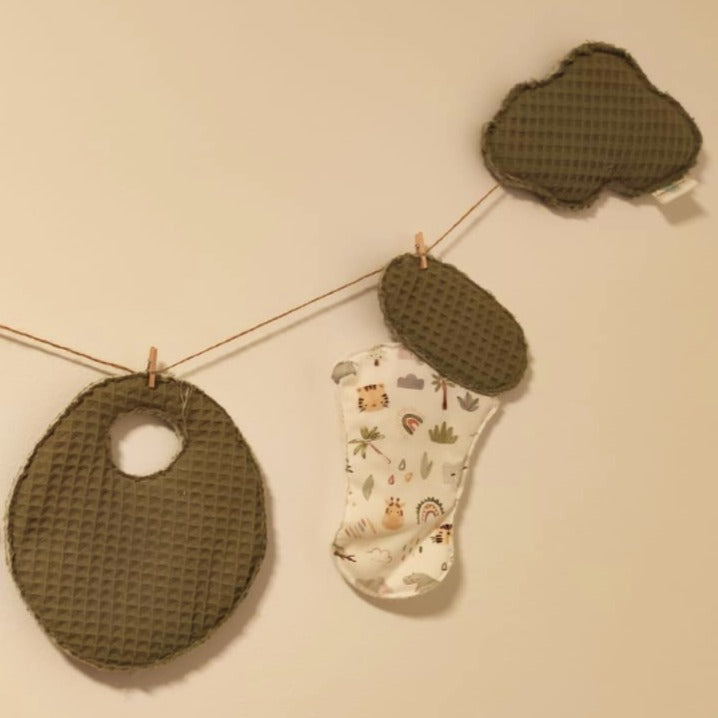 Decora la habitación de tu bebé con esta encantadora guirnalda personalizada que alterna las telas de tu elección. Incluye dos nubes en los extremos, perfectas para colgar en la pared con cinta doble cara extra fuerte.