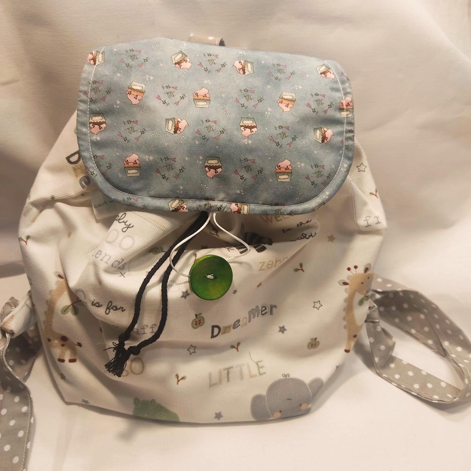 Confeccionada con tela algodón 100% con motivos infantiles que harán de ella, el compañero ideal para tu bebe, en sus primeros días de guardería.