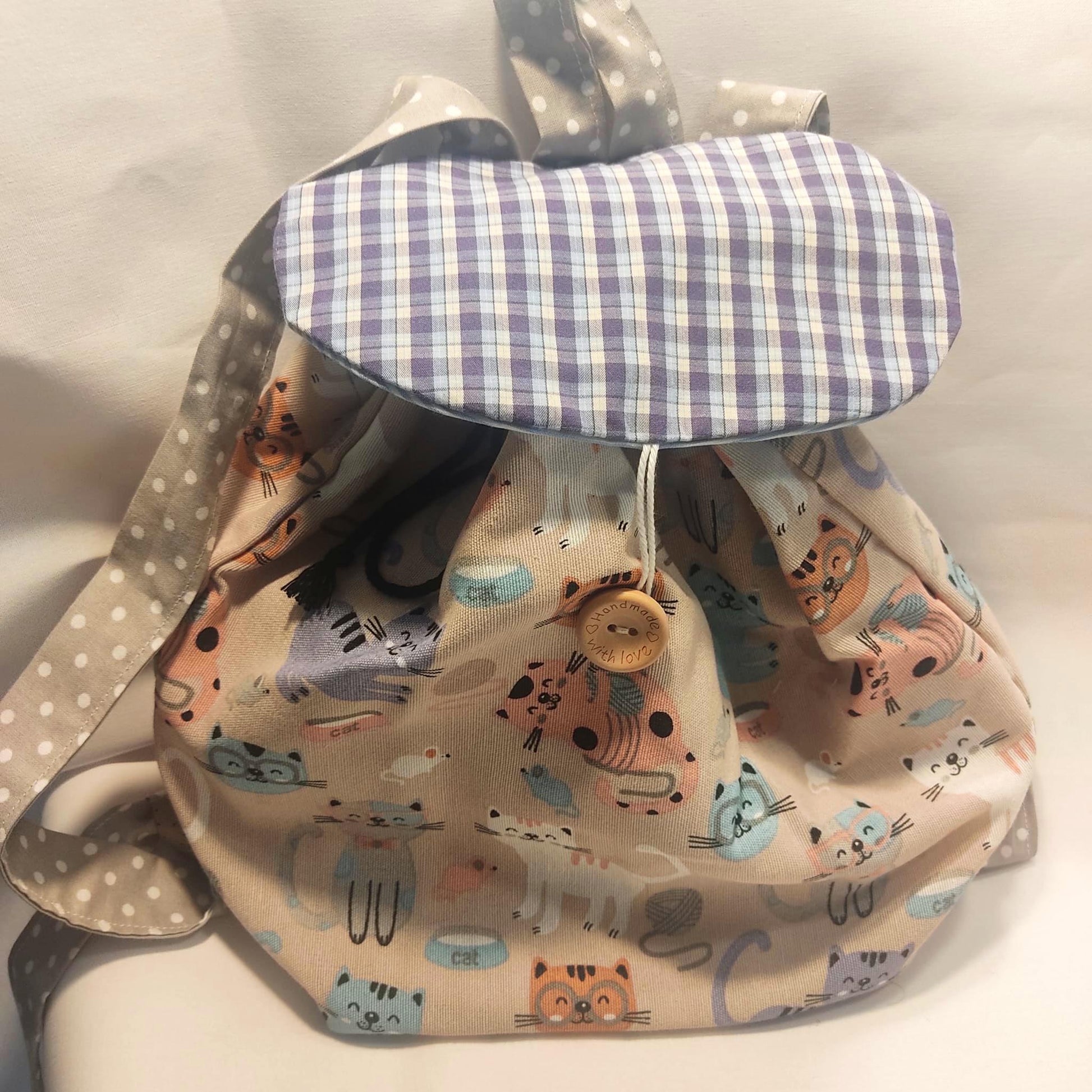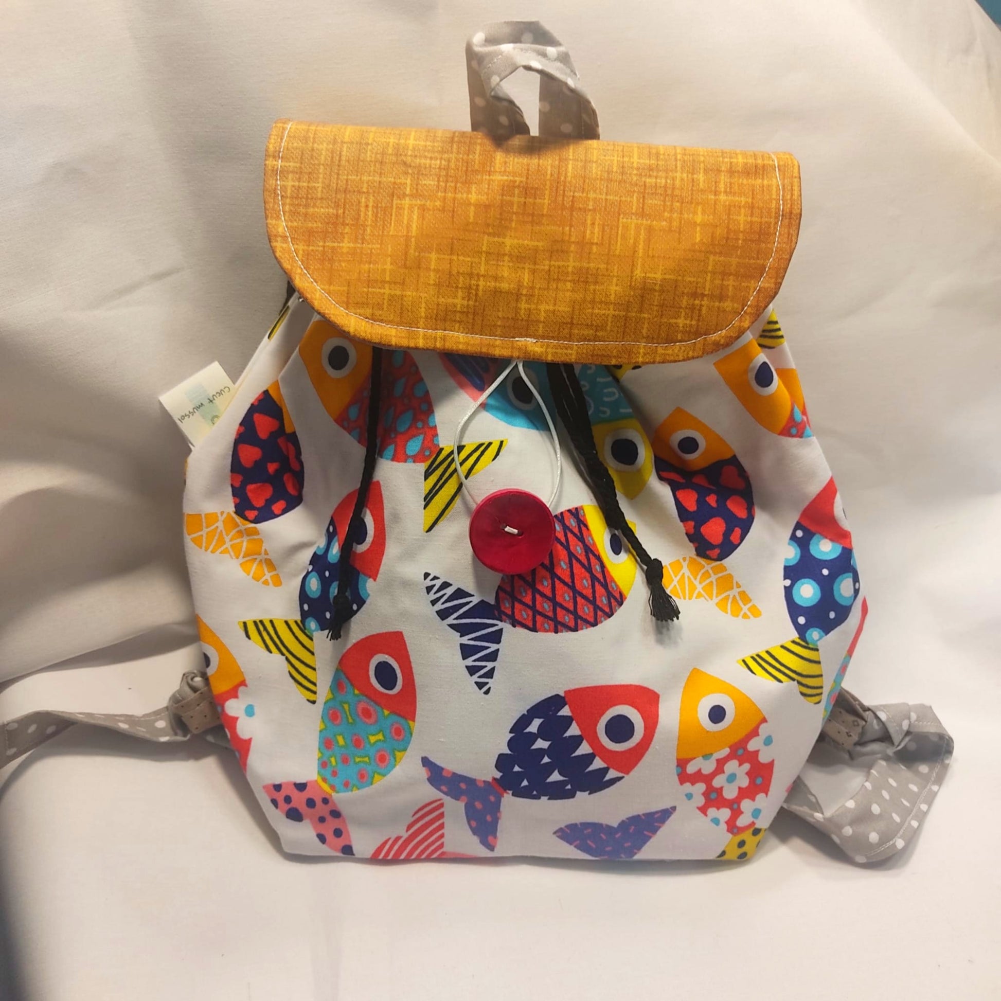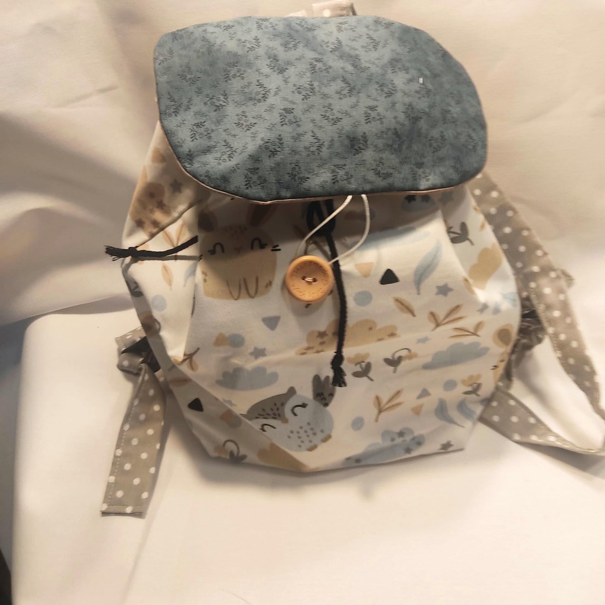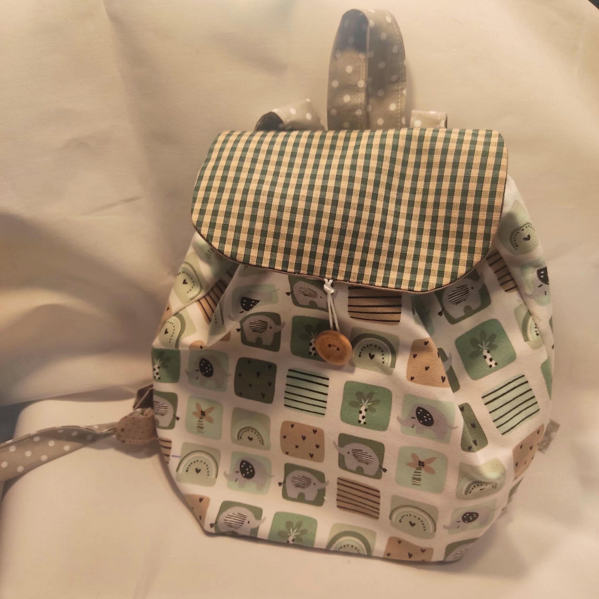 La solapa coordinada y personalizable con cierre por un bonito botón de madera natural o a color. Dos tiras regulables por nudo para la espalda y una central para colgar.