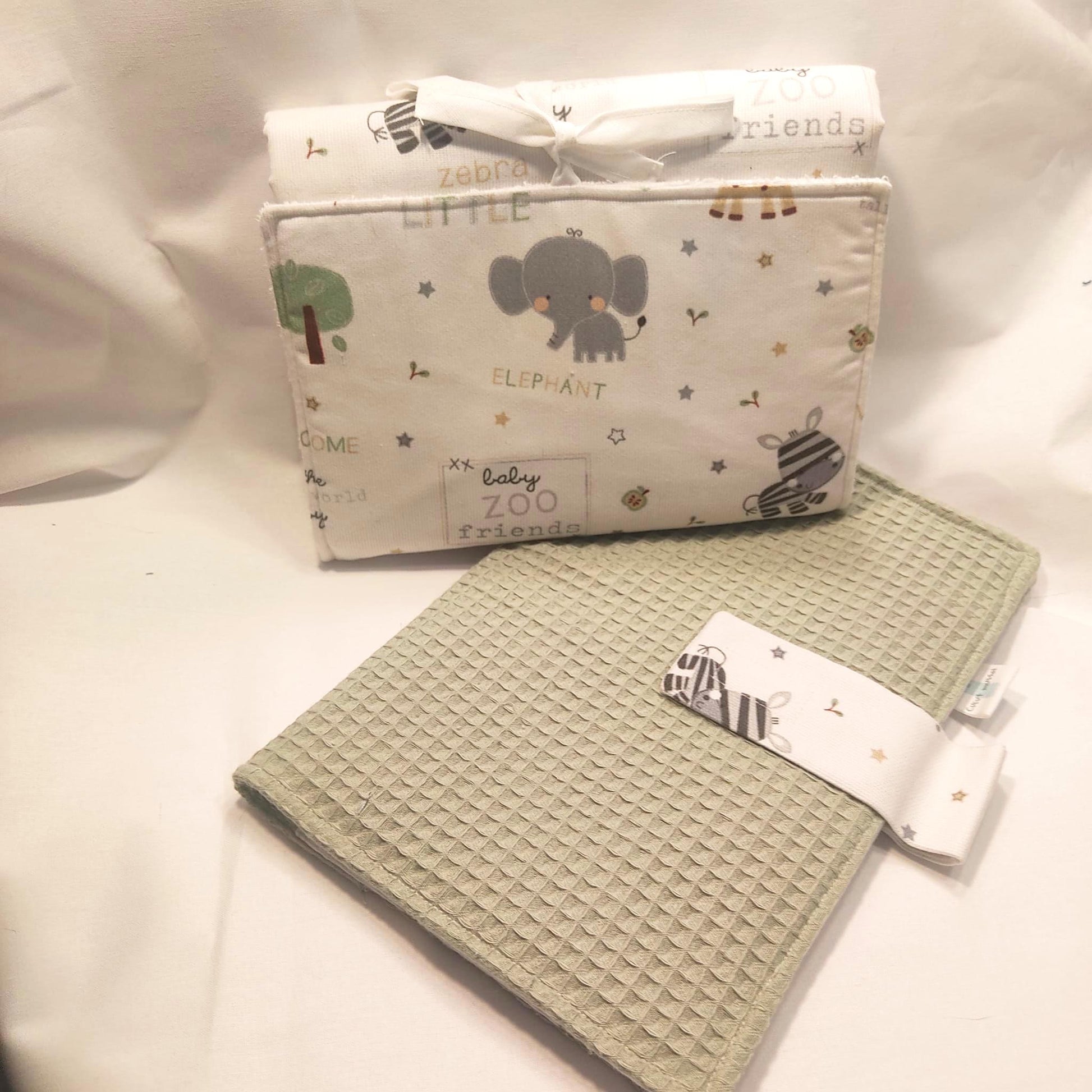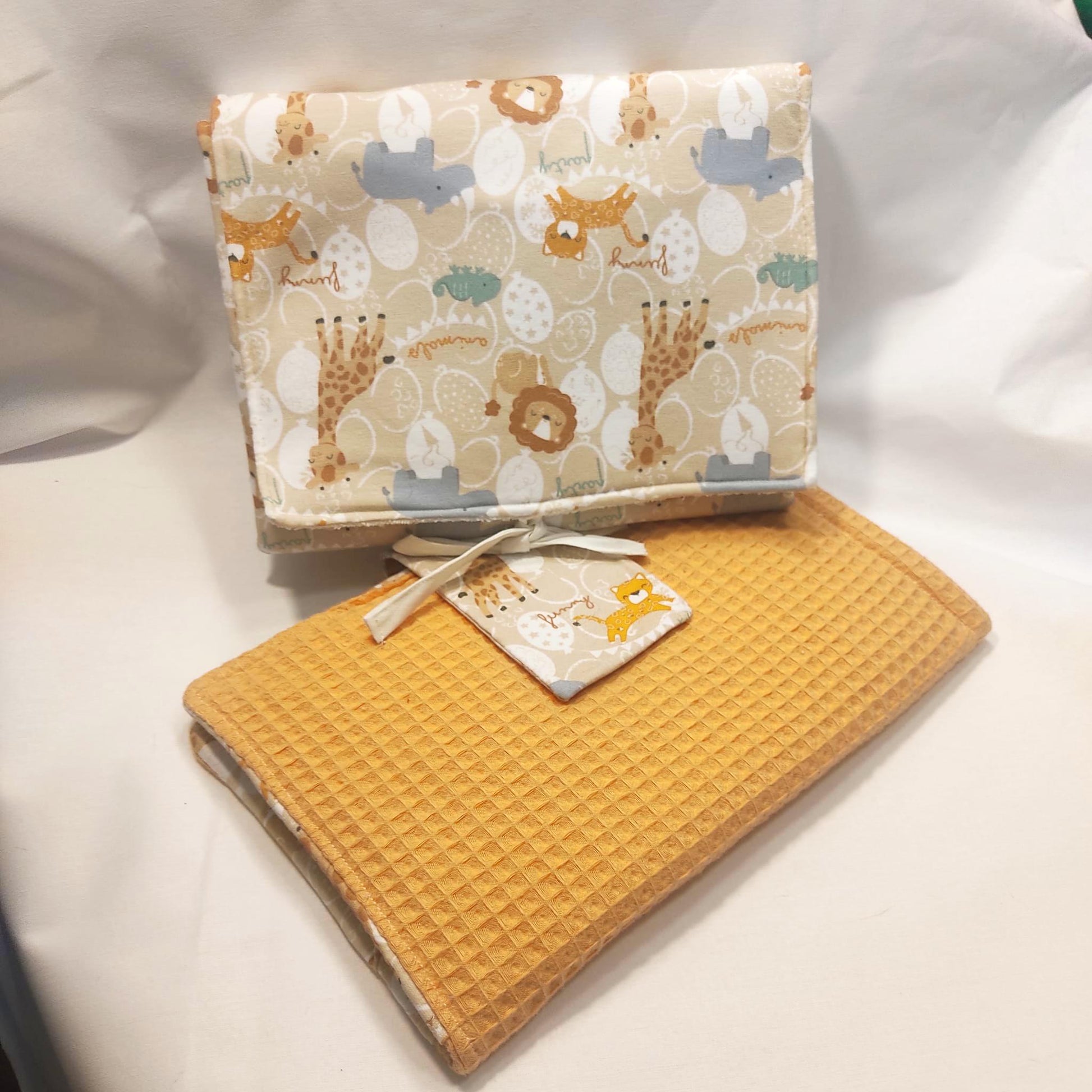 Básico y sencillo, el amigo inseparable del cambiador. Sus medidas 40 x 28 abierto, con tres bolsillos interiores, te permitirán guardar unos cuantos pañales, toallitas y cremas. Cuando lo cierres, tendrá un practico tamaño de 20 x 28. Realizado en la tela principal de tu elección y en el exterior la tela pique waffle coordinada. Cierre por velcro.