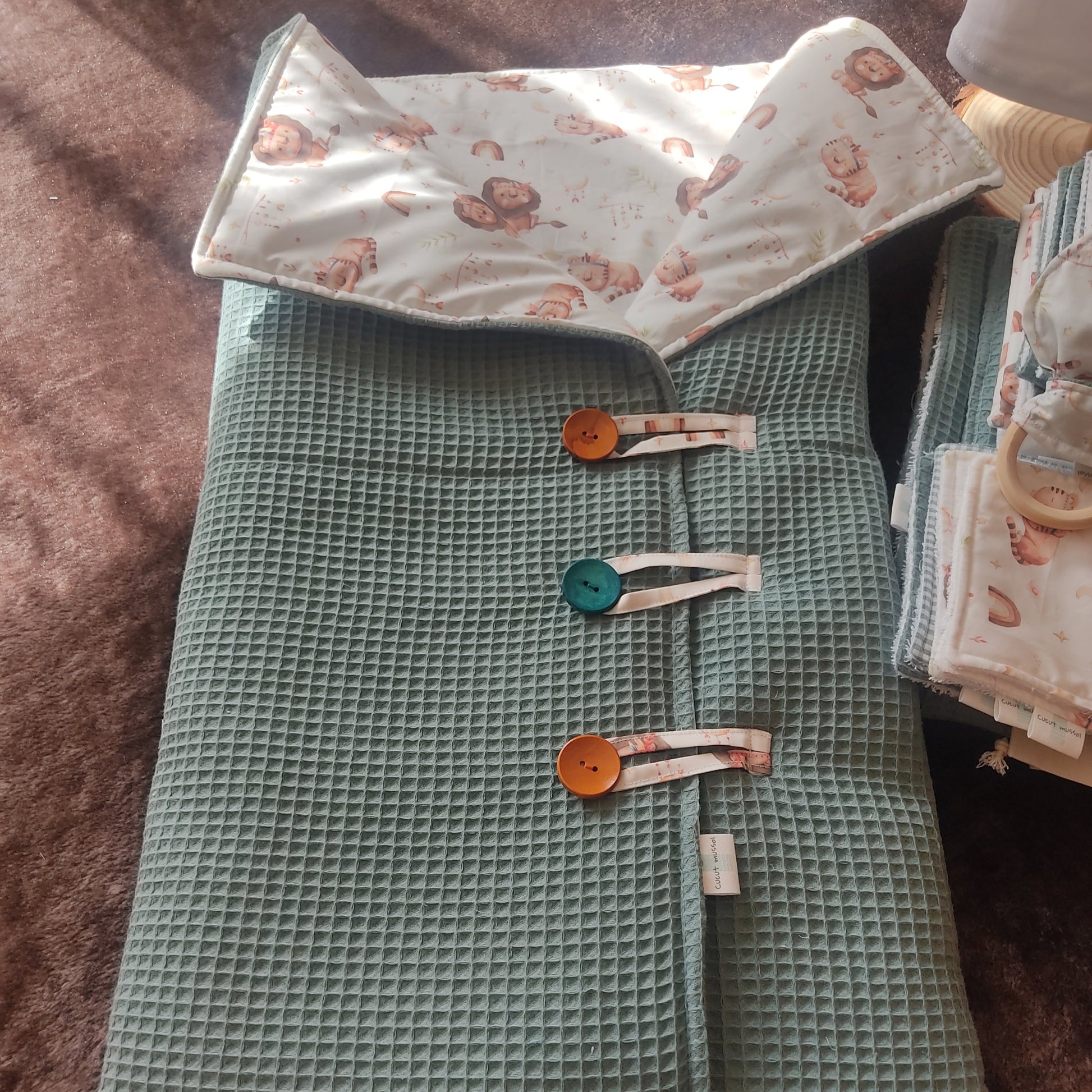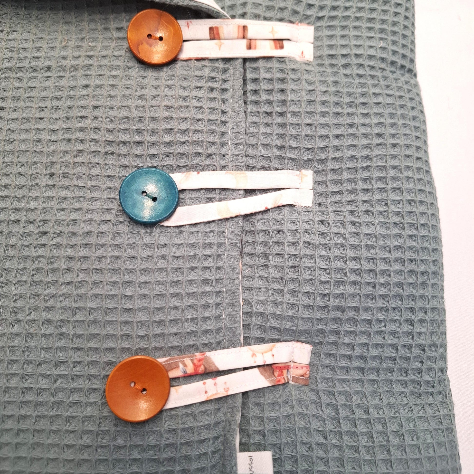 Gracias a su acolchado grueso, abrigará y protegerá a tu bebe del frio. La tela exterior waffle utilizada, coordina con la tela principal que hayas escogido que, en el caso del saco, se encuentra en el interior. Cerrado por delante con 3 cintas hechas con la tela principal que enganchan unos bonitos botones de madera de colorines a juego con las telas.