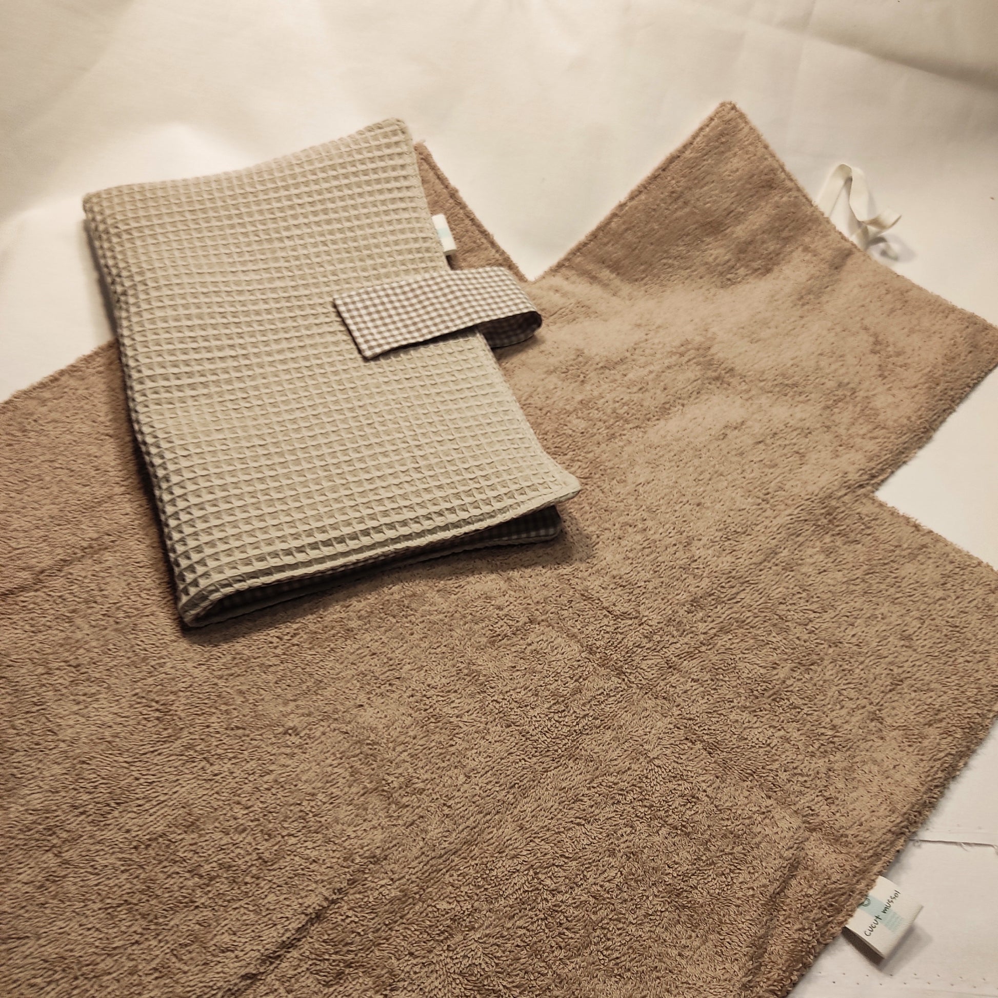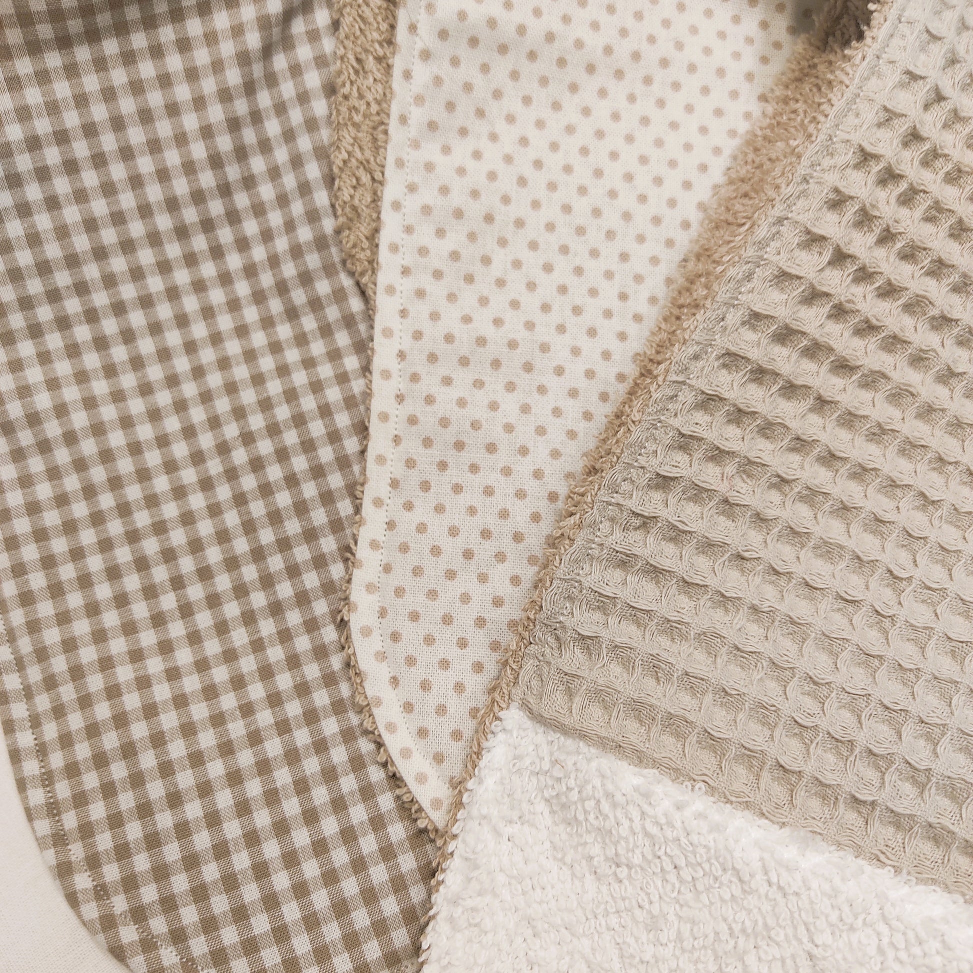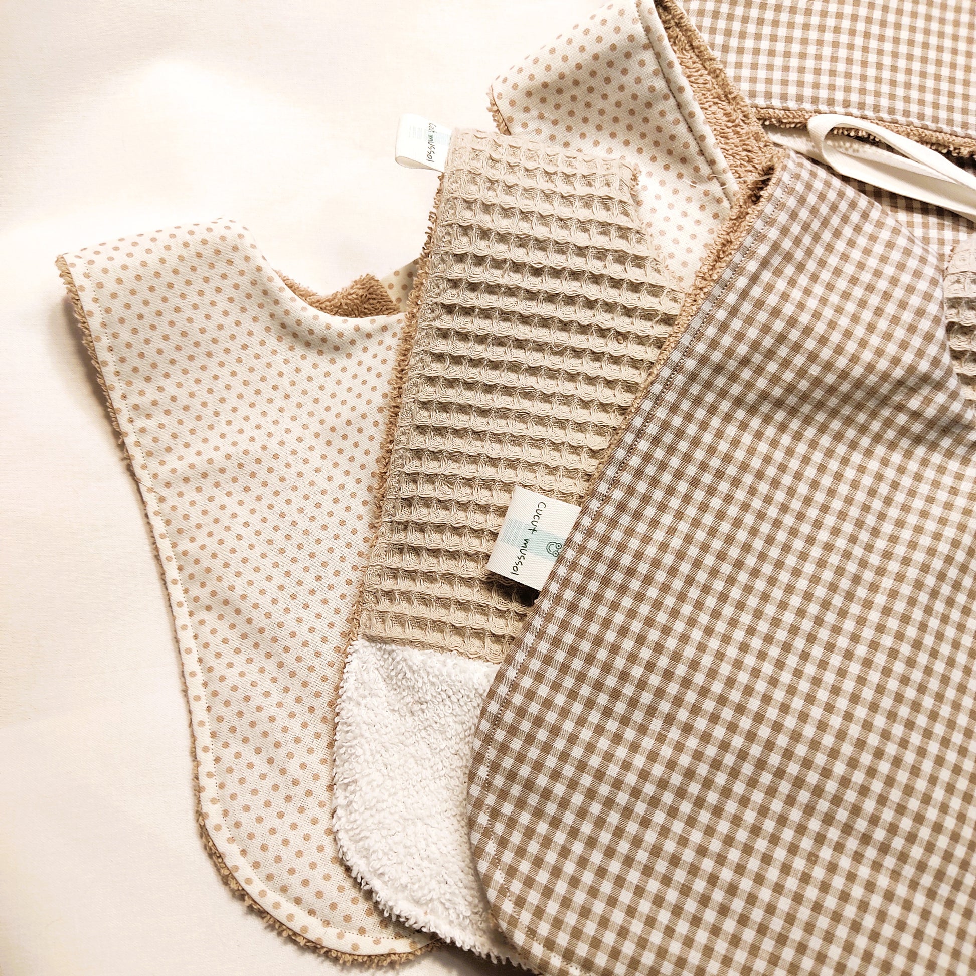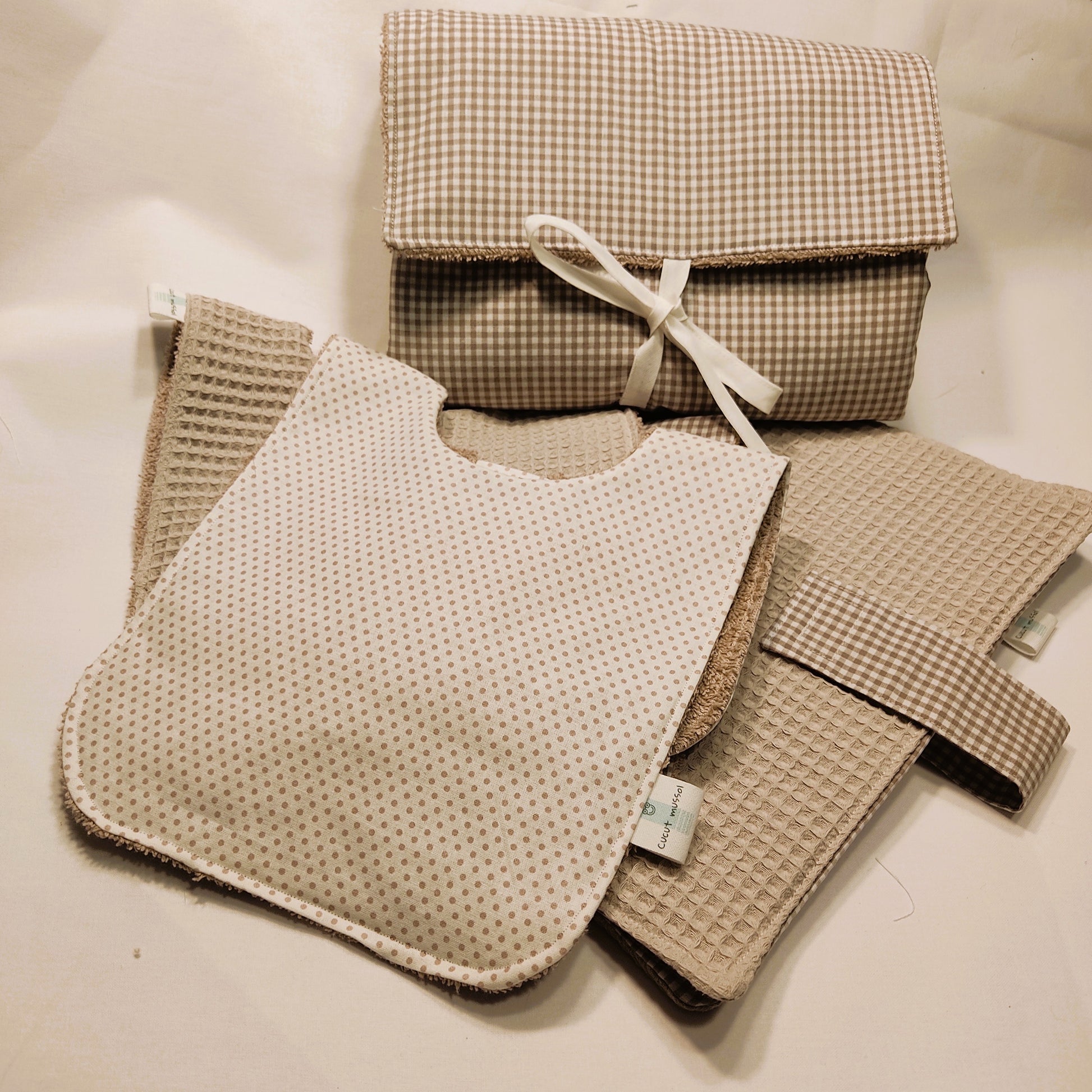 El set básico es un perfecto regalo para el recién nacido, práctico por sus indispensables complementos realizados con telas vichy y topitos, atemporales que nunca pasan de moda, tela waffle y tela rizo a color, coordinados para tener un conjunto básico impecable.