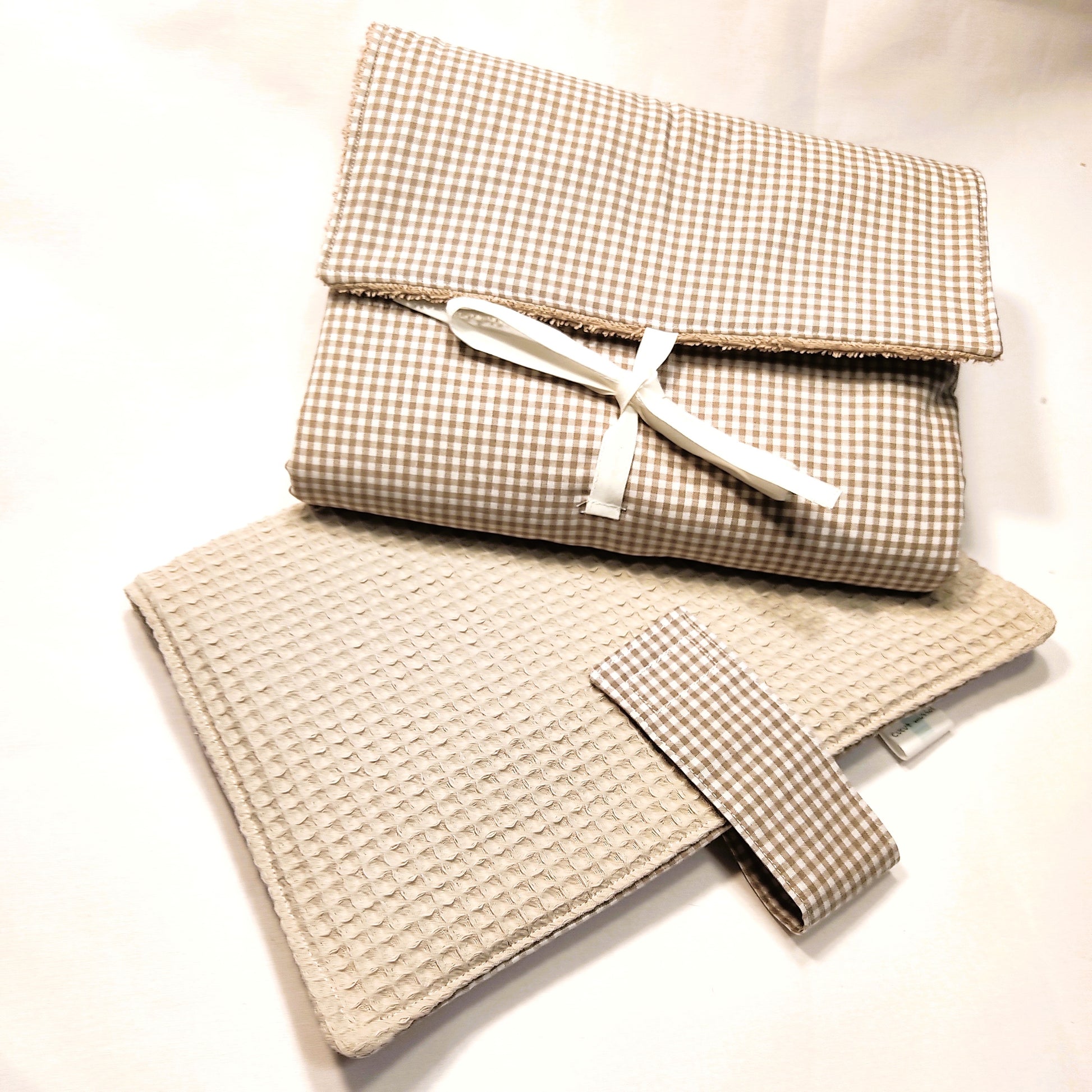 Porta pañales: Básico y sencillo, el amigo inseparable del cambiador. Sus medidas 40 x 28 abierto, con tres bolsillos interiores, te permitirán guardar unos cuantos pañales, toallitas y cremas. Cuando lo cierres, tendrá un práctico tamaño de 20 x 28. Realizado en tela vichy en su interior y en el exterior la tela waffle. Cierre por velcro.