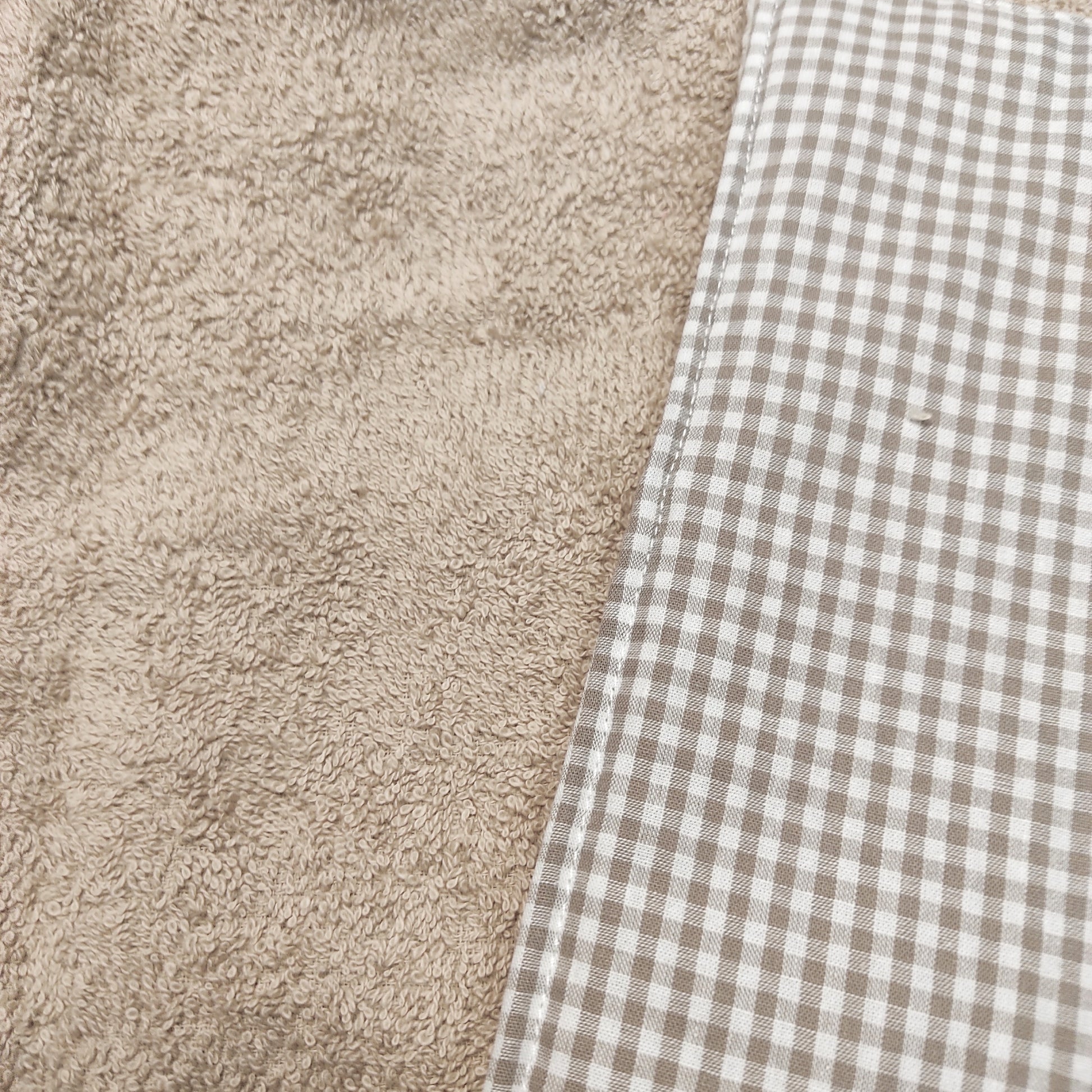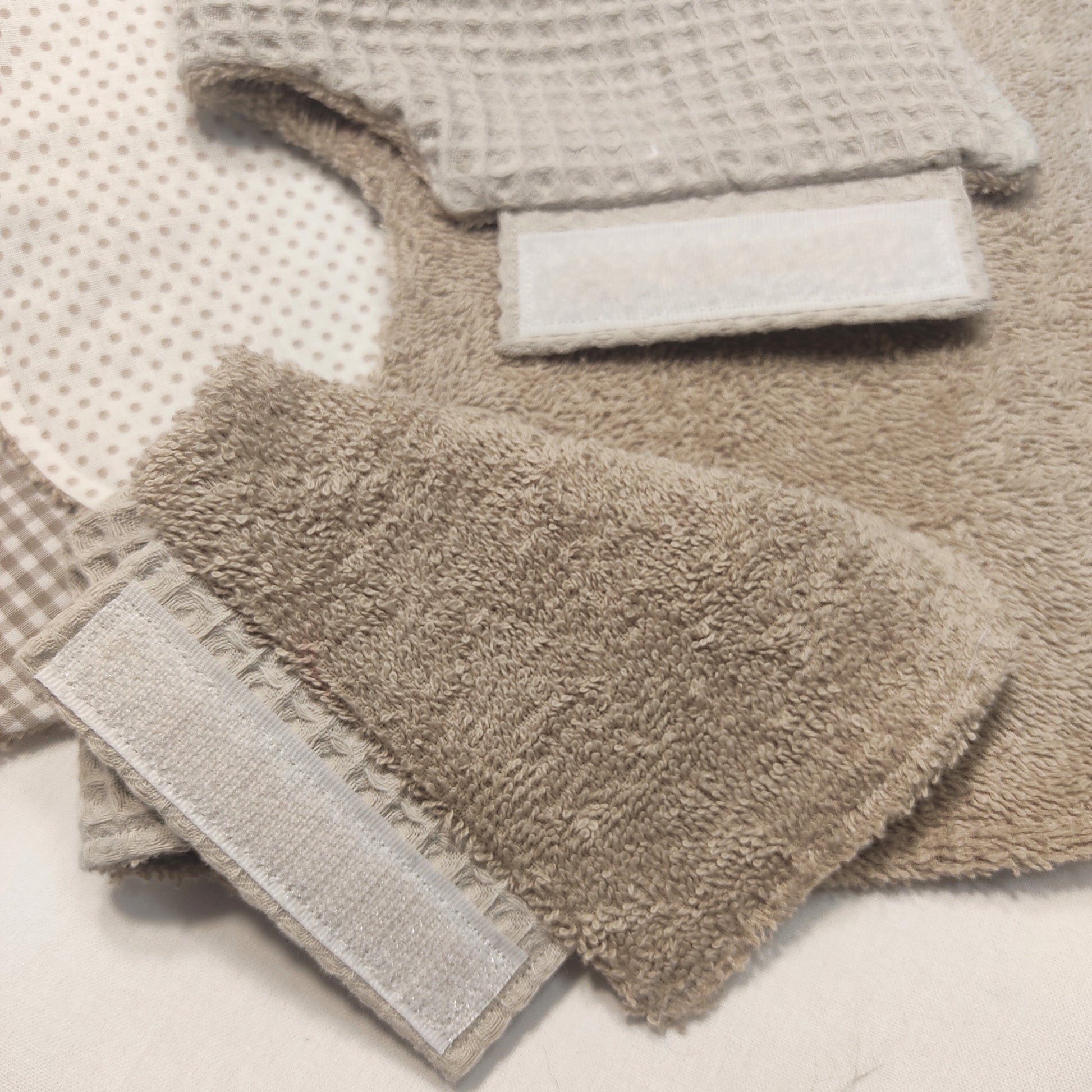 Realizado en telas atemporales coordinadas y en el dorso tela rizo a color del mismo tono. Cierre con velcro en la espalda.
