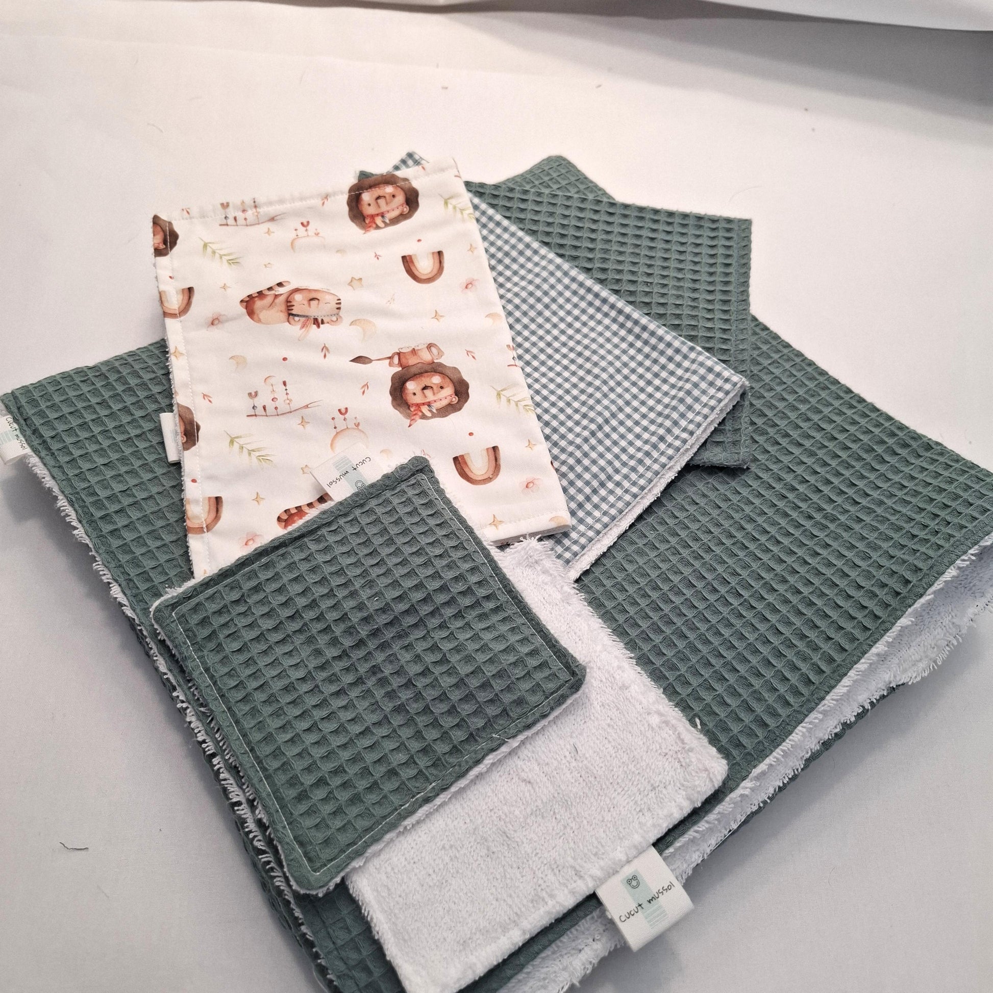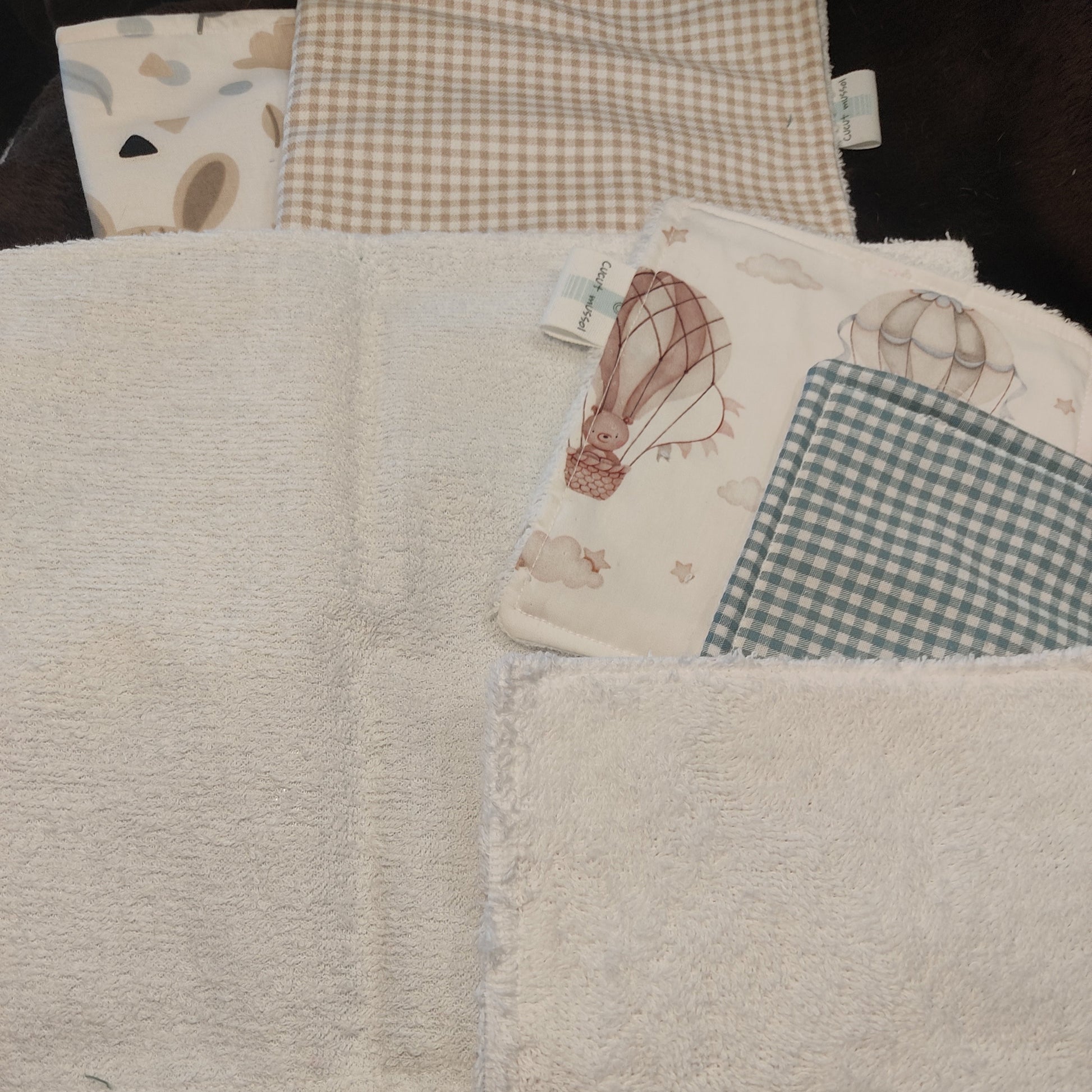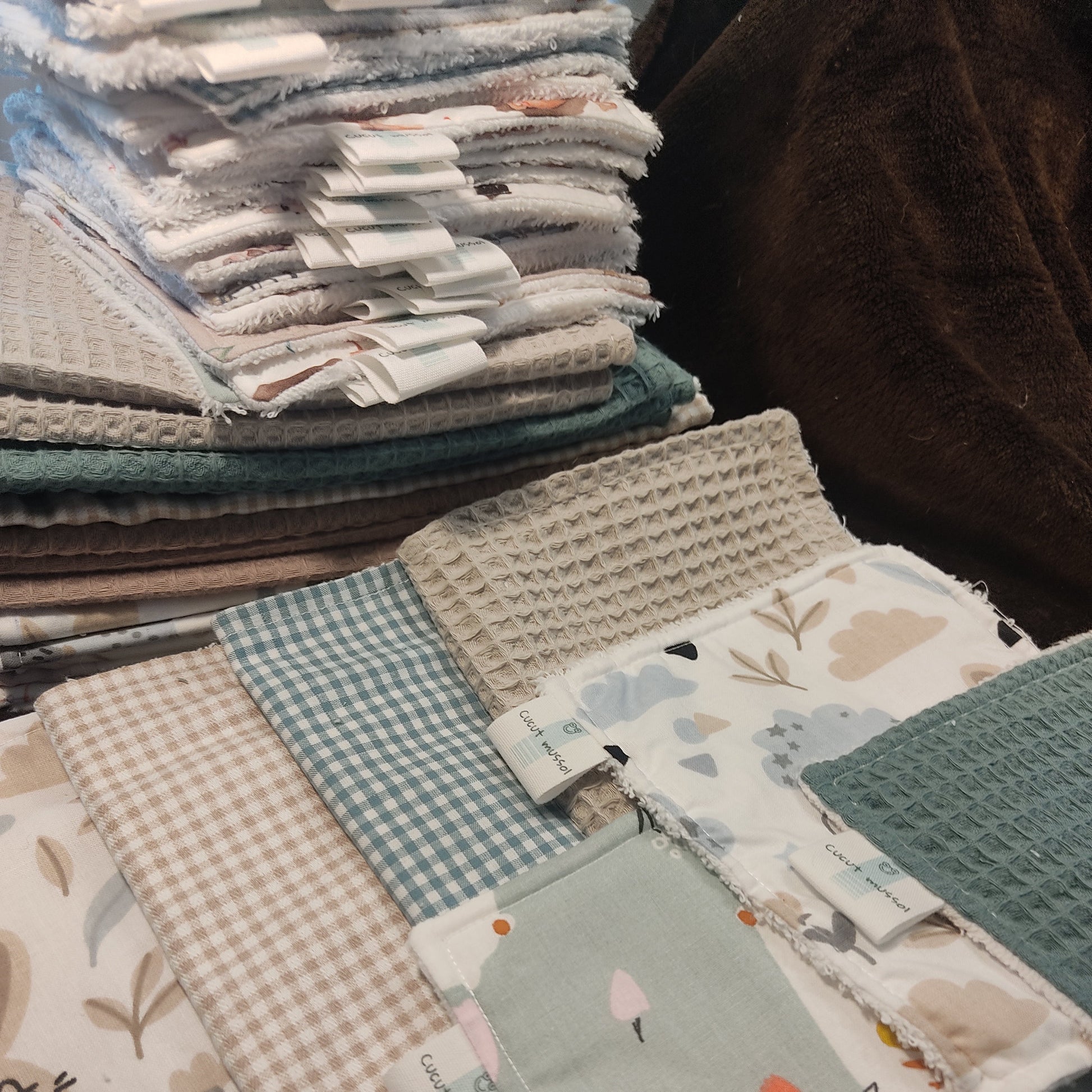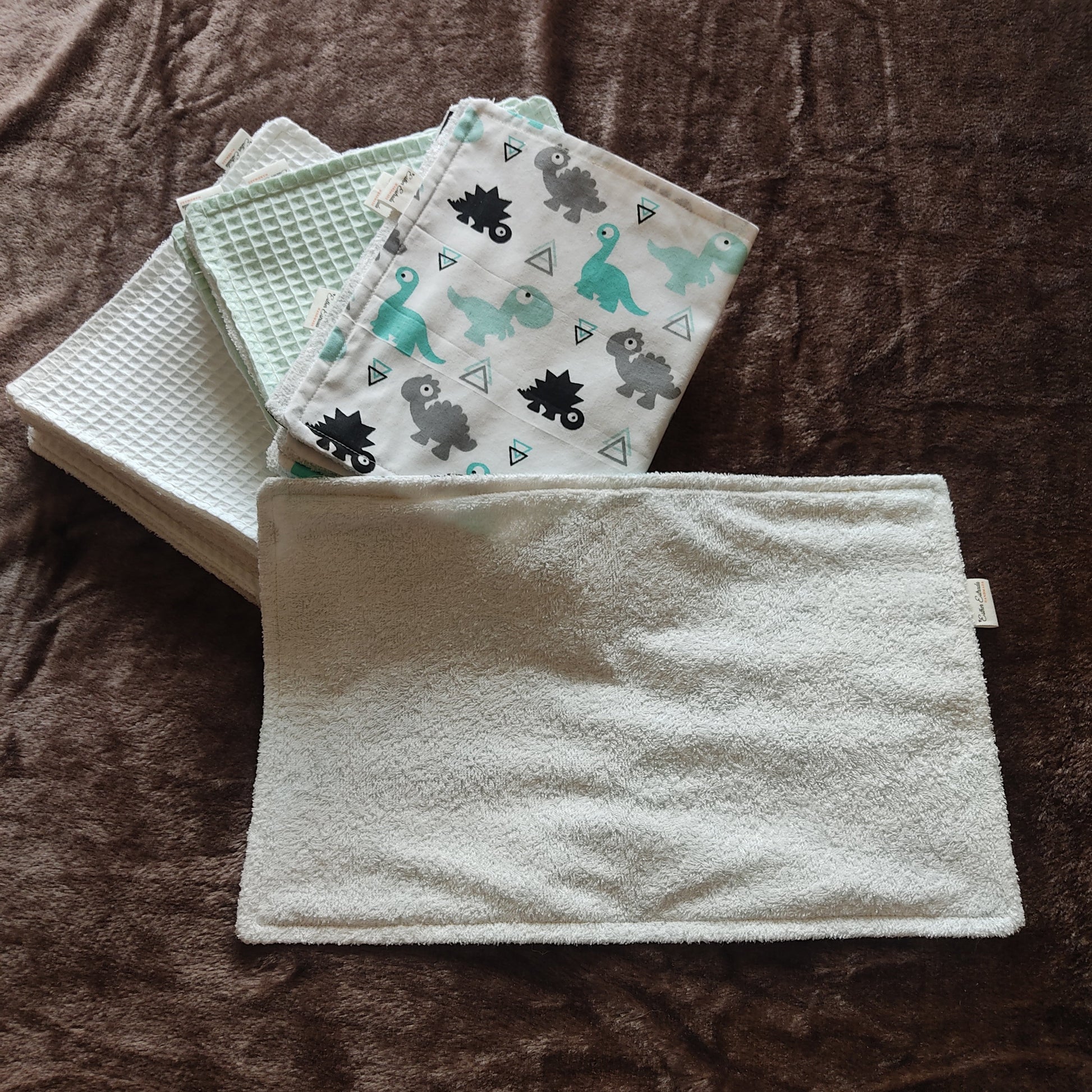 Sobre mini toallitas: ¡Imprescindibles para el cuidado diario de tu bebé! Estas pequeñas toallitas de 15 x 15 cm son ideales por su tamaño compacto y múltiples usos. Confeccionadas con la tela principal de tu elección, tela piqué waffle y tela atemporal en la cara, y tela de rizo blanco de gran calidad en el dorso, ofrecen una considerable capacidad de absorción y suavidad al tacto.