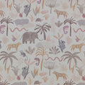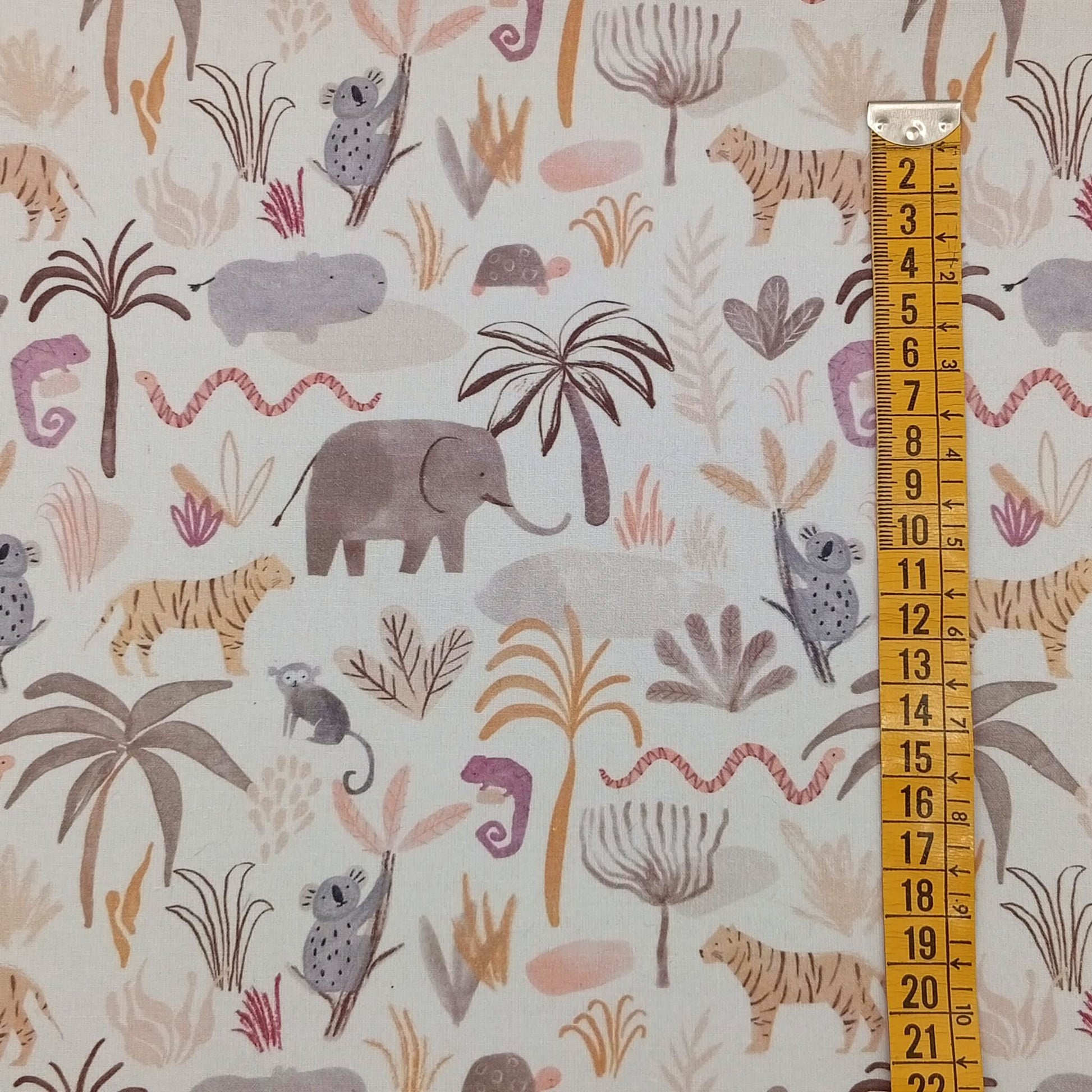 Popelín de algodón con un estampado infantil de animales y vegetación, inspirado en la selva. Elefantes, tigres, koalas y pequeños detalles vegetales se distribuyen de forma equilibrada sobre fondo claro, con una paleta suave y bien armonizada que aporta ritmo sin saturar.
